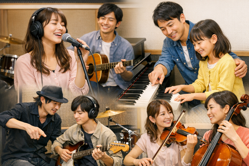 ボイトレ・ピアノ・ギター・ドラムなど、幅広いコースに対応しています。自分のやりたいジャンルに合わせて選べるため、趣味から本格的なスキルアップまで対応可能です。無料体験時に相談することもできます。