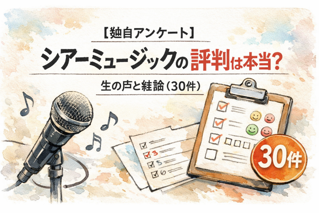 本記事では、シアーミュージック受講経験者への独自アンケート30件(匿名)をもとに、良い評判・気になる評判をデータで整理し、後悔しない選び方までまとめました。